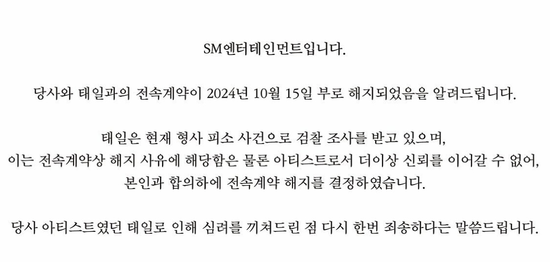 2016년 NCT U로 데뷔한 문태일은 이후 NCT 127 등에서 활발히 활동해왔고, 팀 내 맏형이자 메인보컬로 팬들의 큰 사랑을 받았습니다. 그러나 이번 사건으로 인해 SM엔터테인먼트는 2024년 10월 전속계약을 해지하며 연예계에서 사실상 퇴출을 선언했습니다.
